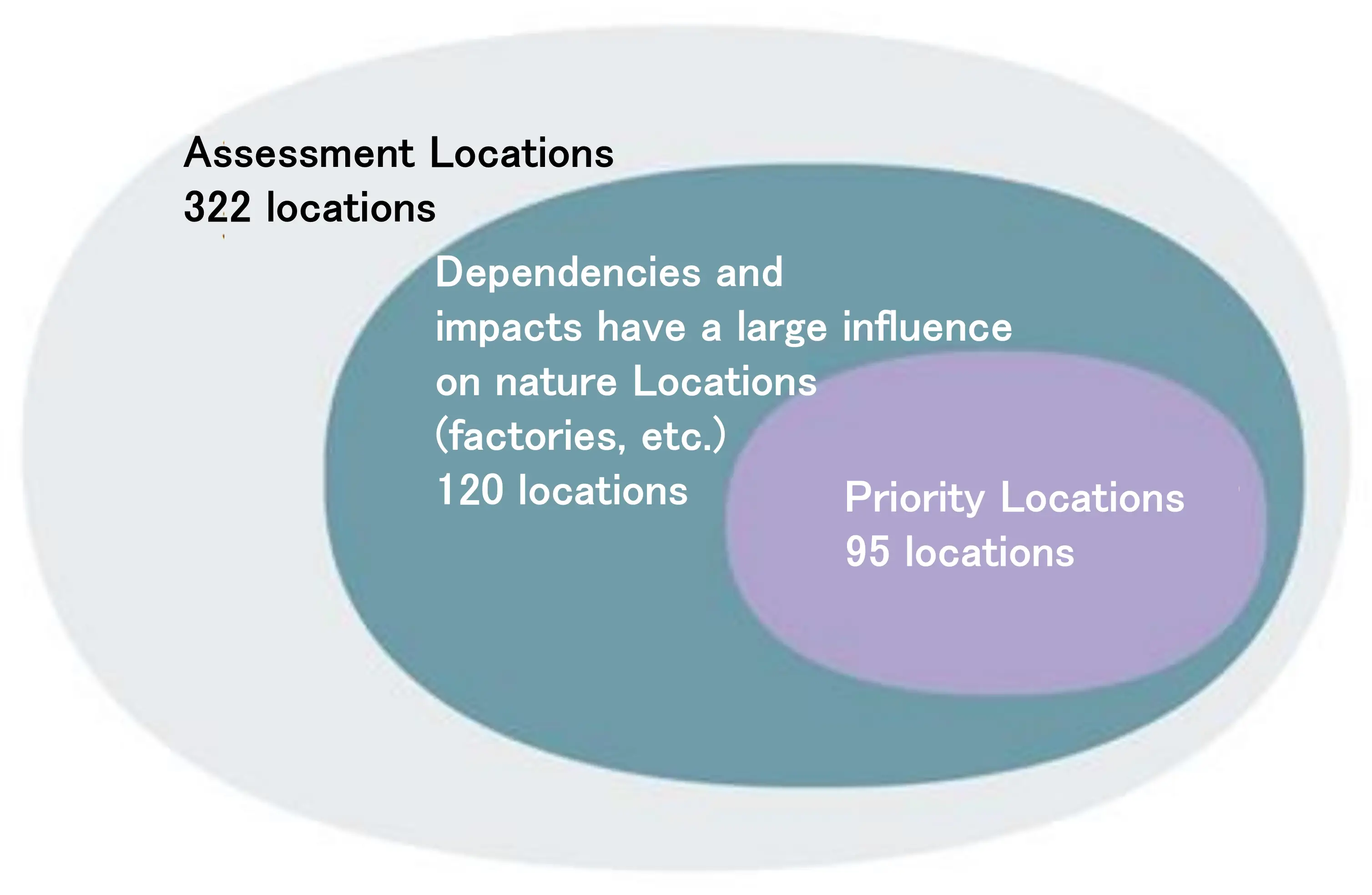 • Among large sites in dependencies and impacts related to the nature of business activities, sites that meet either "sensitive locations" or "important sites" were identified as priority areas