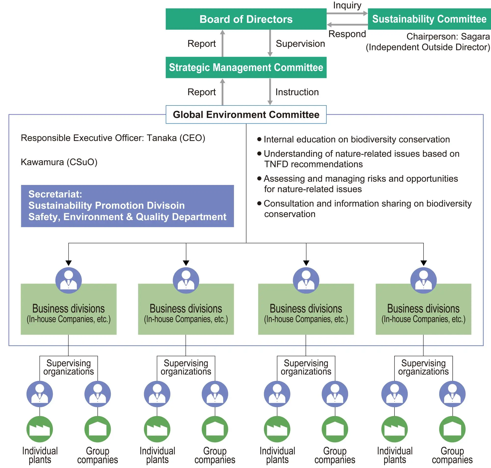 We have appointed CSuO to segregate our management strategies, including responding to the issue of Sustainability issues, including addressing biodiversity conservation. We have also established a Safety, Environment & Quality Dept. of the Corporate to plan and promote the Group’s strategic initiatives for risks and opportunities related to biodiversity conservation . In addition, the Global Environment Committee, which the Safety, Environment & Quality Dept. serves as the secretariat, promotes internal educational activities related to biodiversity conservation, establishes activity policies, identifies nature-related issues based on the TNFD recommendations, assesses and manages nature-related risks and opportunities, prepares activity plans for a nature-positive society, and other discussions and information sharing related to biodiversity conservation. These activities are reported to the Strategic Management Committee and the Board of Directors for appropriate monitoring. (Matters for deliberation by and reporting to the Strategic Management Committee and Board of Directors)