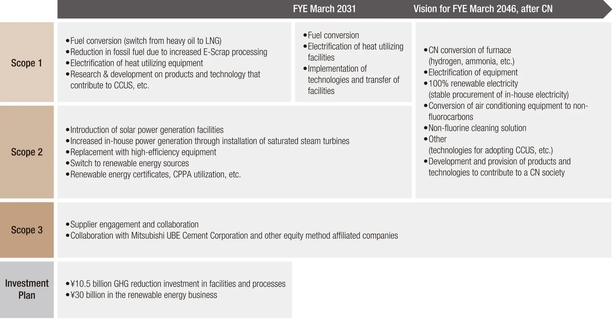 To achieve these goals, we will invest ¥10.5 billion in energy-saving measures and facility improvements, mainly at manufacturing sites, and ¥30 billion in renewable energy projects by the fiscal year ending March 2031.We will continue advancing energy savings and reducing emissions from fossil fuels at our manufacturing sites. We will also develop products that contribute to a carbon-neutral society and technologies such as CO2 capture and processing. Furthermore, by utilizing available technologies and other measures, we aim to achieve carbon neutrality by fiscal year ending March 2046, including reductions in GHG emissions from resource circulation initiatives.