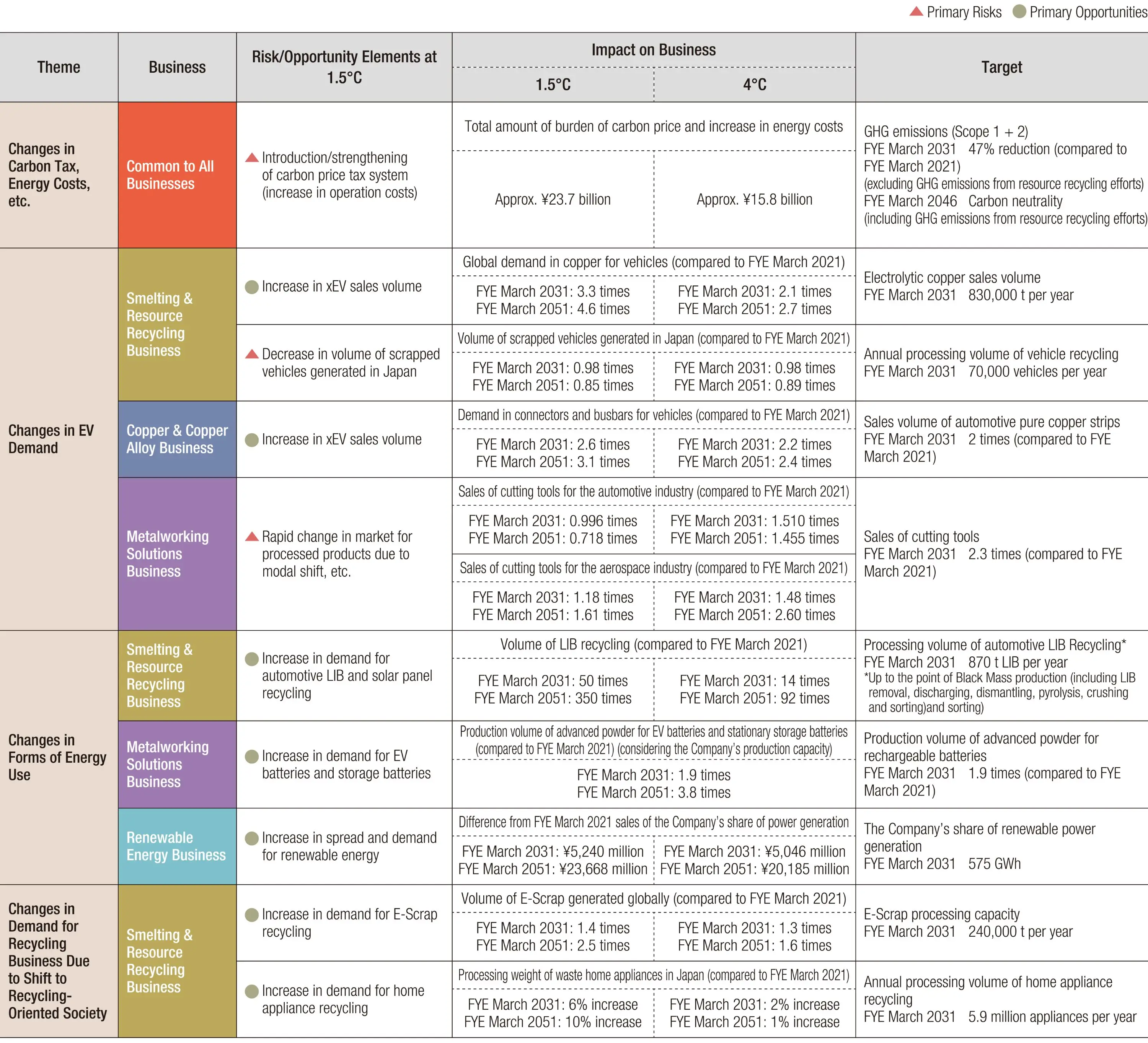 With regard to transition risks and opportunities, in February 2023 we updated our scenario analyses while maintaining consistency with the Medium-term Management Strategy FY2031, and set business indicators and targets. We set themes and analyzed them in the 1.5ºC and 4ºC scenarios. As a risk that is common to all business operations, we estimated the financial impact on the Group in the event that policies and legislation on climate change were stepped up, and carbon pricing was introduced and strengthened. We also analyzed the impact on our business operations in terms of risks and opportunities with regard to the shift in EV demand, changing forms of energy use, and changing demand for the recycling business due to the shift to a recycling-oriented society. Further, in terms of physical risks, in our Group-wide risk management activities we also manage water risks including damage from acute and chronic risks including torrential rain, flooding, storm surges and droughts thought to have materialized in relation to climate change.