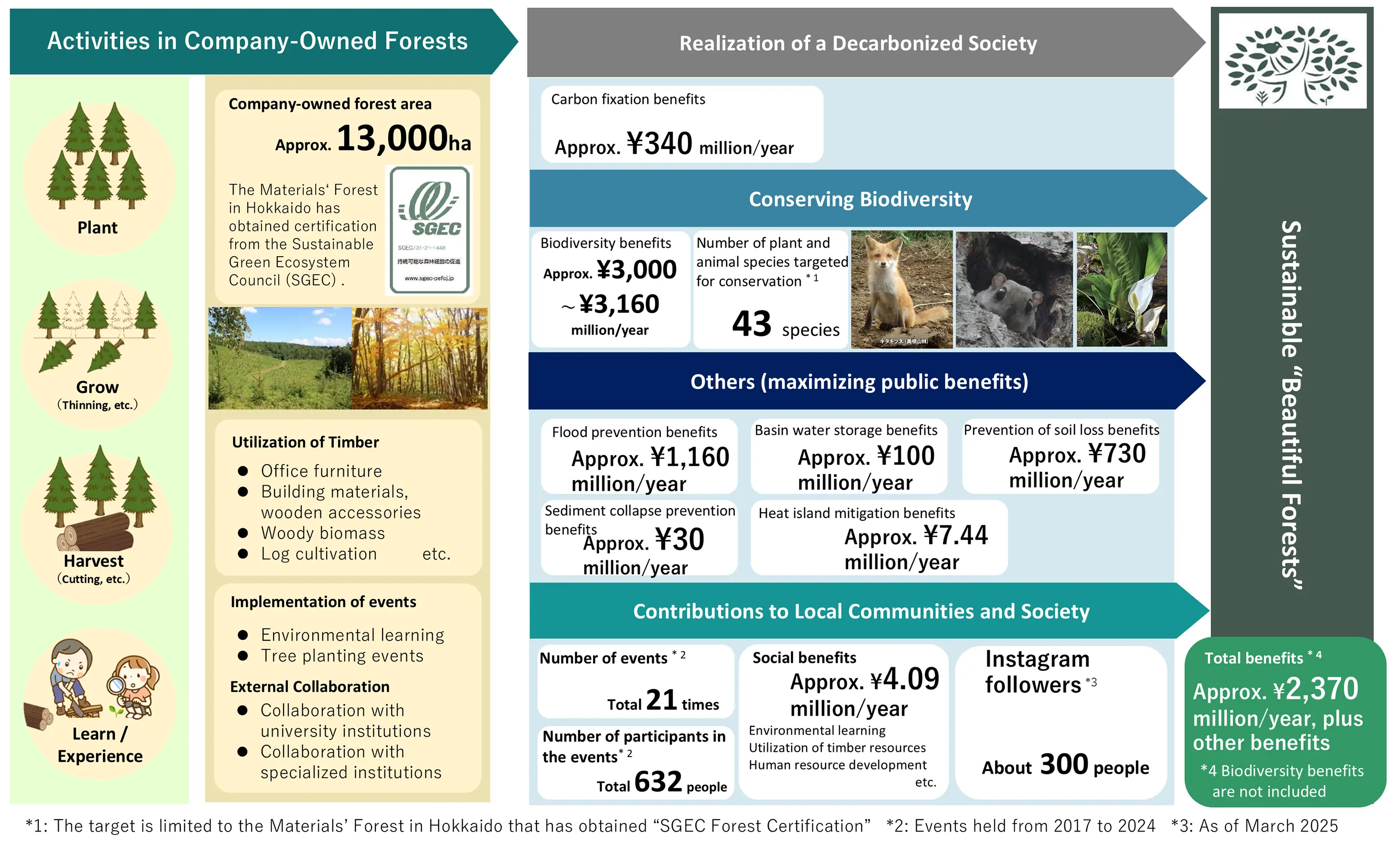 In our company-owned forests (the Materials’ Forests), we are engaged in social contribution activities such as providing timber through forest maintenance and offering environmental education as part of our efforts to contribute to society toward nature-positive. We quantitatively assessed the public benefit functions provided through these activities and the economic value derived from forest management.