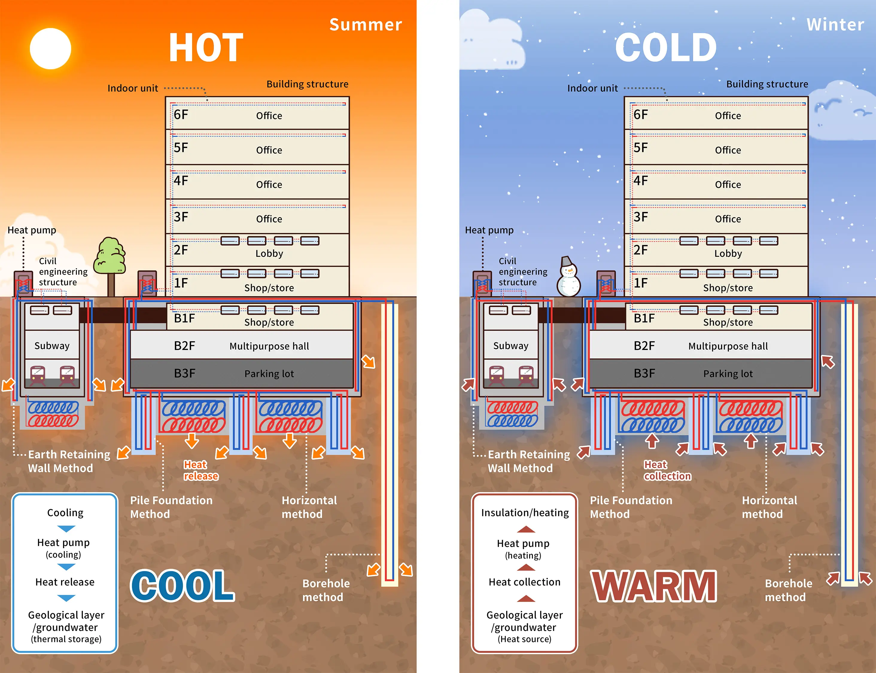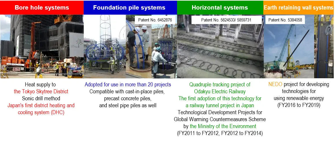The company has continued its R&D efforts and acquired patented technologies through projects commissioned by the government and others, aiming to become the No.1 company in geothermal technologies. As a result, the company has succeeded in building infrastructure using ground-source heat by developing commercial systems with various heat exchange methods, including not only the common borehole method but also its patented foundation pile method as well as horizontal and earth retaining wall methods. At present, Mitsubishi Materials Techno Corporation is promoting sales of these technologies as systems for using ground-source heat utilized through urban infrastructure, aiming to contribute to urban development in the future.