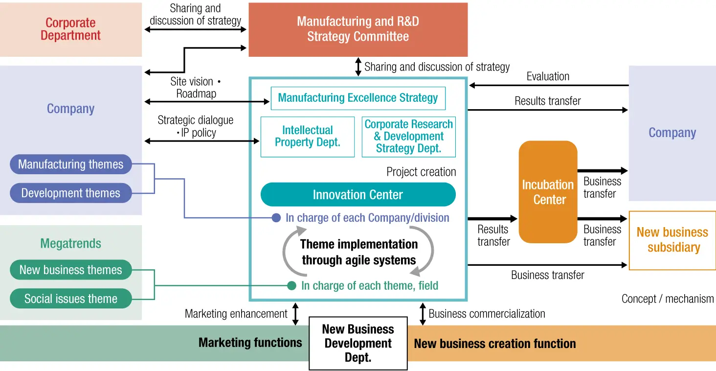 We have established the Monozukuri and R&D Strategy Div., consolidating departments related to manufacturing (production technology), development, marketing and new business to fully integrate everything from the creation of ideas and R&D through to mass production and commercialization. In the division's Innovation Center, we have set up a structure to efficiently utilize human resources along the lines of each R&D/manufacturing challenge or new business theme, enabling us to create new products and businesses, pursue development focused on solutions, and acquire new technologies. We have also established an Incubation Center, where we cultivate and strengthen businesses created in the Innovation Center, as well as businesses deemed difficult for an in-house company to expand on its own. To promote coordination inside and outside the Group, reinforce business foundations and advance the creation of new businesses as well as to aim to develop and secure professional human resources across the company and continuously improve their level of expertise, in the fiscal year ending March 2025 we have also established a New Business Development Dept., Intellectual Property Dept., Strategy and R&D Strategy Dept. and Monozukuri and Corporate Production Engineering Dept. inside the division.