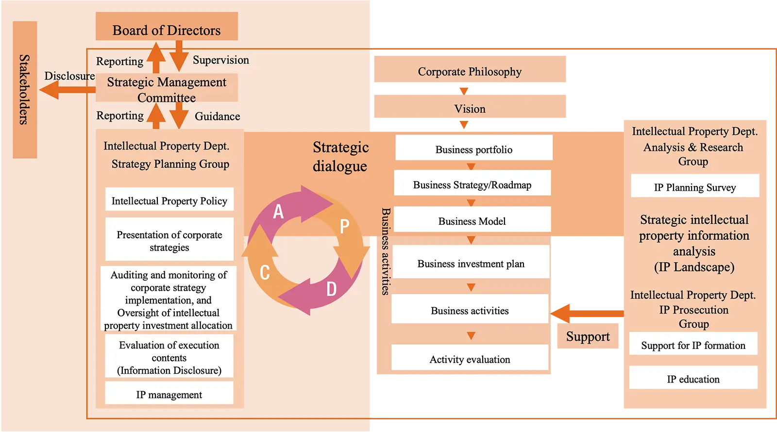 We believe it is important to engage in initiatives related to governance, Strategic Dialogue and intellectual property creation, management of technology contract risks, intellectual property education, and the enhancement of countermeasures to product counterfeiting. Based on the "Group Intellectual Property Regulations," we will organically integrate these functions to maintain and improve the level of IP governance throughout the Group, and contribute to reducing IP risks and maximizing Group business value.