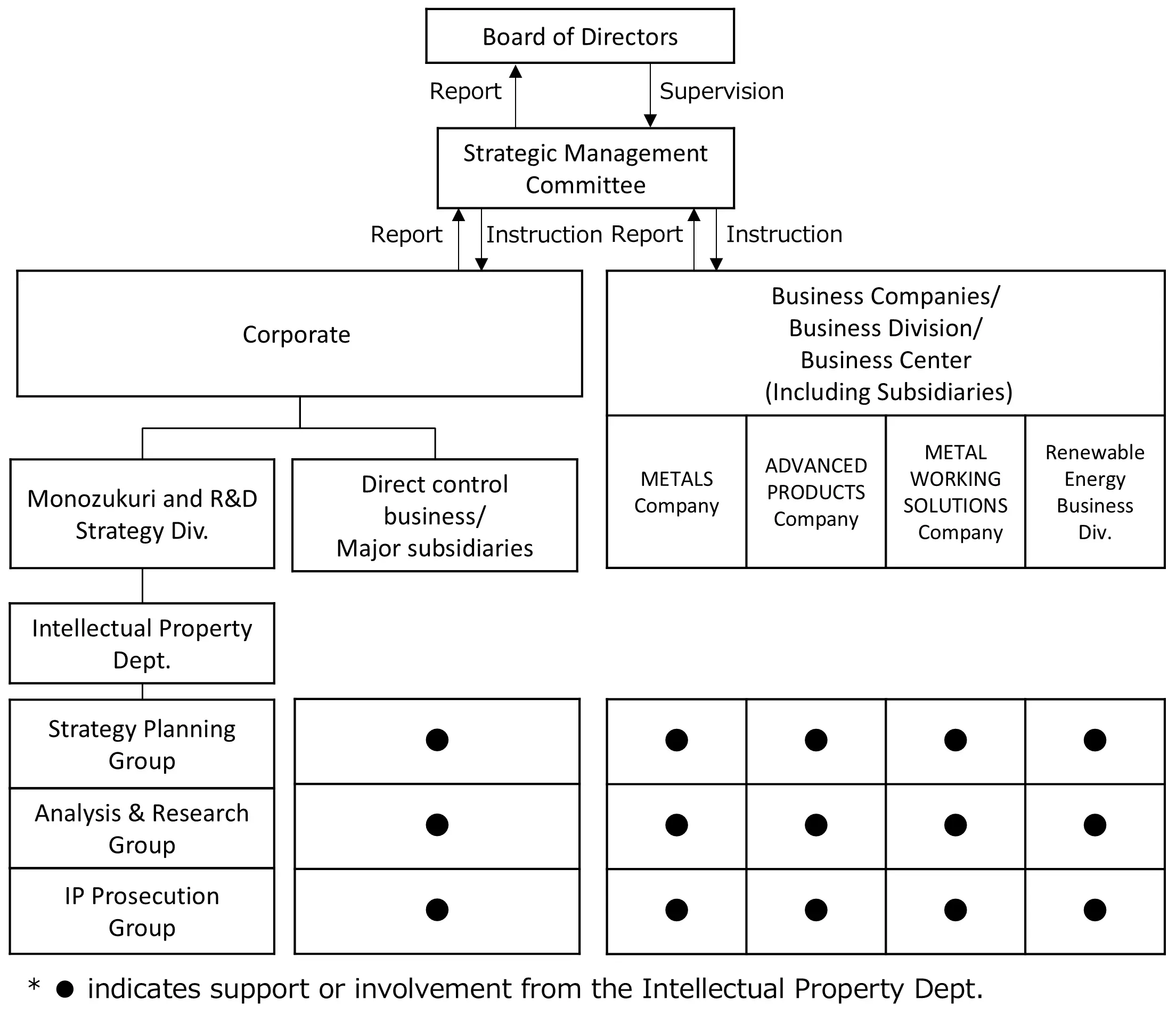 As the importance of intangible assets including intellectual property, within corporate value continues to grow, we are reinforcing our governance systems related to intellectual property in compliance with the Corporate Governance Code. Specifically, we are reinforcing our governance structure through regular reporting and deliberation with Executive Officers and Directors, while actively disclosing our intellectual property initiatives, such as our ‘Strategic Dialogue’, to external parties. Further, in May 2022 we established the Intellectual Property Policy of Mitsubishi Materials Group, which indicates the direction of our intellectual property activities as a Group, based on the idea that we should maximize the value of intellectual property and intangible assets in a Group-wide manner. Additionally in February 2023, in accordance with this Intellectual Property Policy, we formulated the Group Intellectual Property Regulations, which stipulate the intellectual property-related activities of Group companies in clearer terms.