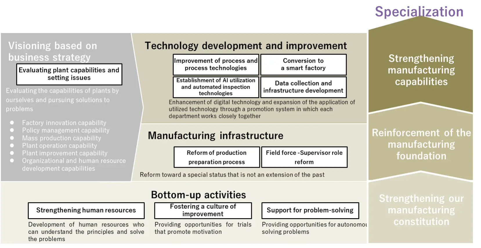 To reinforce our foundation and enhance our management capabilities, we will work together with companies and sites on their methods, including in the areas of productivity management, requirements for producing good products, and front line supervisors.