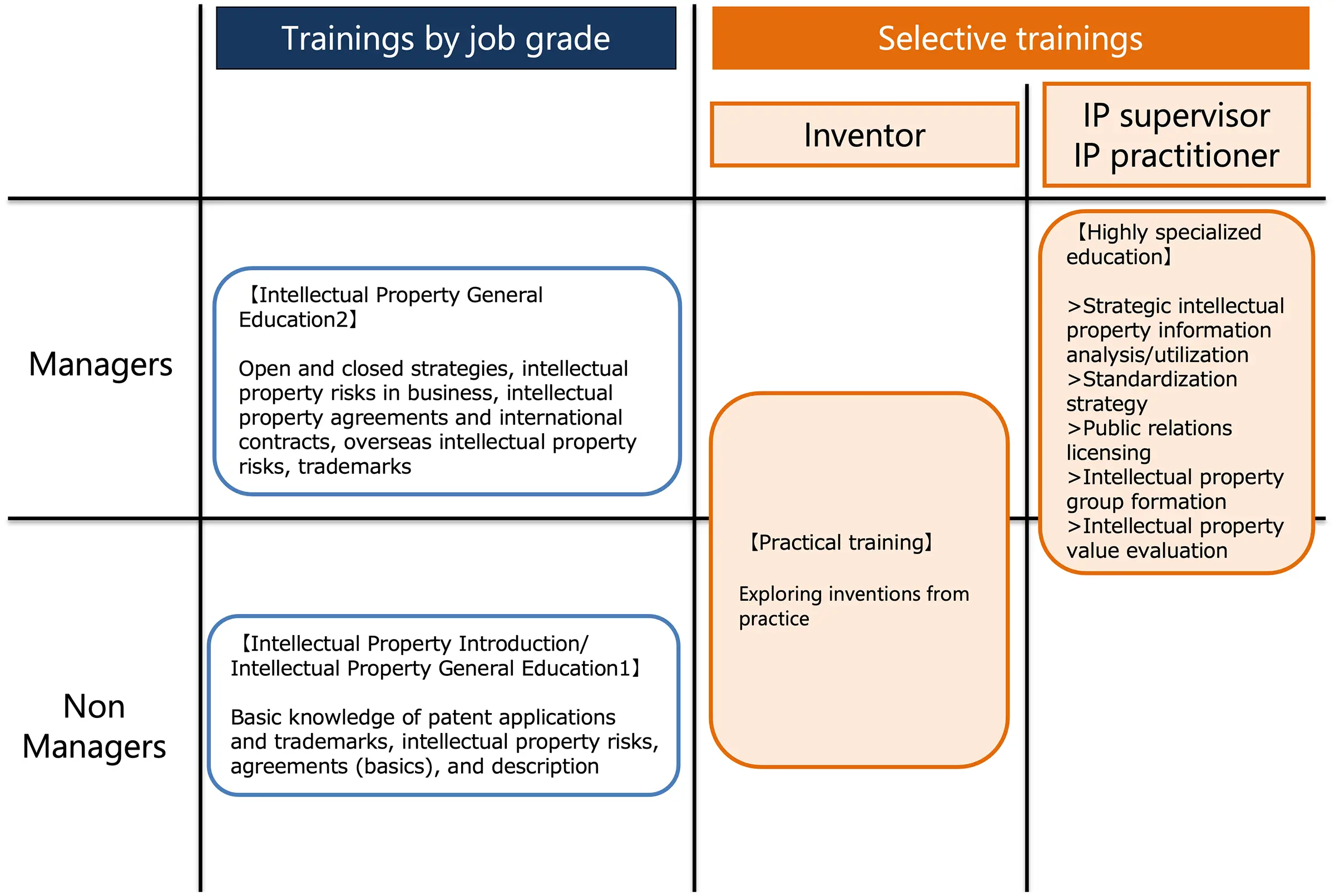 We provide Group employees with training to promote their understanding of intellectual property, utilize intellectual property information in business activities, and further, formulate effective intellectual property. In addition to position-specific training aimed at acquiring basic IP knowledge for both regular and non-regular employees, we also provide practical training for specialized and strategic use of IP as a selective training program.