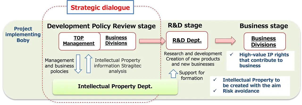 The strategic dialogue is promoted as an intellectual property activity in line with management, business and development strategies and new business strategies. In the strategic dialogue, we hold dialogues with the Companies and new business creation divisions based on the results of analyses of intellectual property information, and strategically formulate the intellectual property needed for business and development. We support new value creation initiatives through various intellectual property activities, including strategic dialogue.