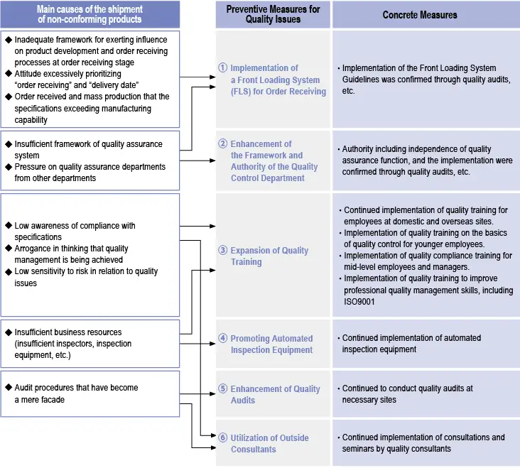 Further, where necessary, Safety, Environment & Quality Dept. and the Company holds quality meetings that are aimed at sharing quality information. At quality meetings, we provide detailed support to each site, such as checking the status of quality management with each site individually and exchanging views. Quality audits are conducted as part of themed audits led by the Internal Audit Dept. The purpose of the quality audit is to confirm the lack of quality fraud and the implementation of effective quality initiatives based on objective evidence. It also aims to identify issues and improvements related to quality, and to provide an opportunity for the audited sites to make continuous improvements.